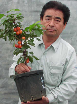 サクランボを本格的に始めたのは平成8年3月のことです。鉢植えにすれば水分がコントロールできるので実らせることができるはずだと考えた私は、山形より苗木12本を取り寄せ、研究をスタートしたのです。